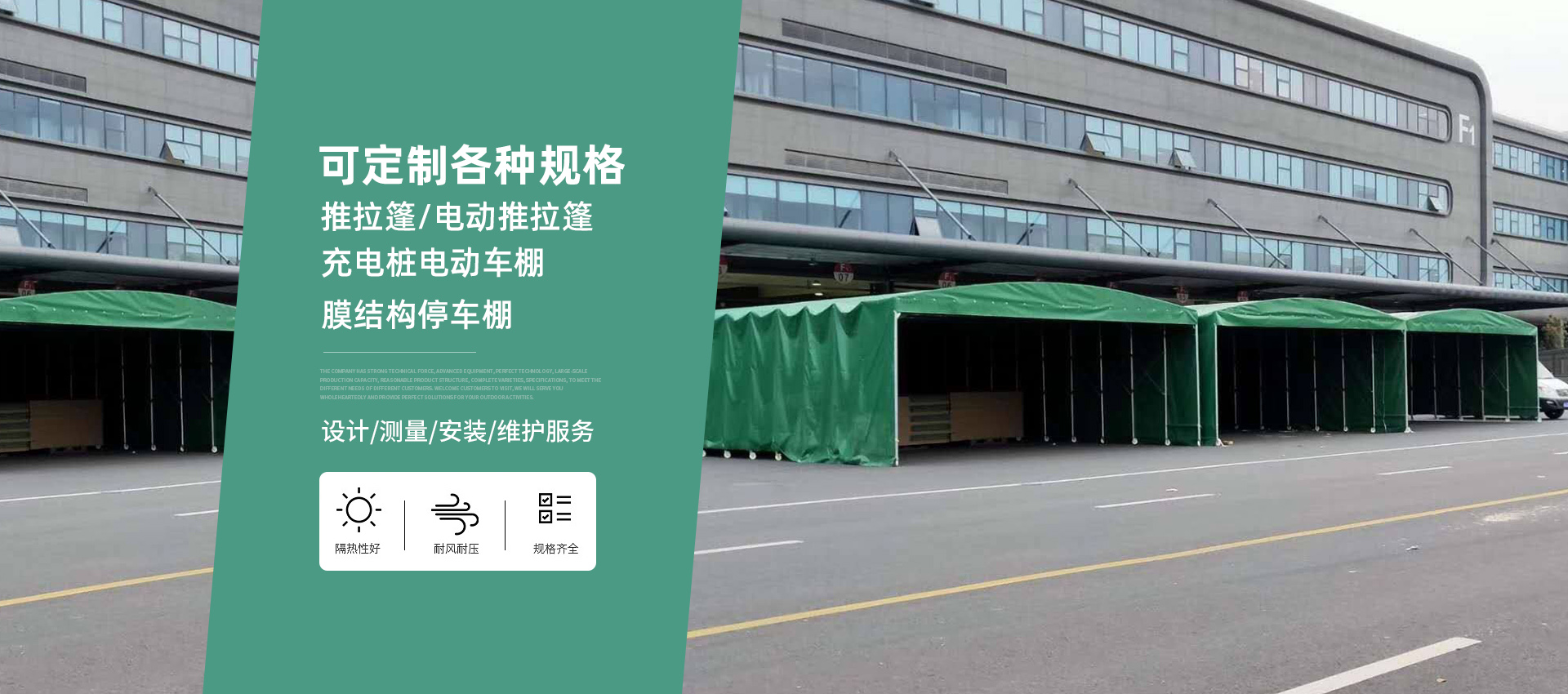 溫嶺市立際棚業(yè)有限公司,是一家主要從事膜結構的研發(fā)、設計制作、安裝、銷(xiāo)售及維護的企業(yè),主要經(jīng)營(yíng):電動(dòng)推拉棚、活動(dòng)棚廠(chǎng)家、折疊帳篷、充電樁車(chē)棚、汽車(chē)景觀(guān)棚、膜結構景觀(guān)棚、移動(dòng)推拉棚等,我們生產(chǎn)技術(shù)標準,擁有精良的加工工藝,嚴密的質(zhì)量體系,為廣大客戶(hù)提供高品質(zhì)車(chē)棚產(chǎn)品,得到了廣大客戶(hù)的肯定和贊賞。我們始終堅持以顧客需求為導向,竭誠為您服務(wù),立際棚業(yè)本著(zhù)以誠待人、信譽(yù)至上,不斷開(kāi)拓進(jìn)取的精神風(fēng)貌,確保了...